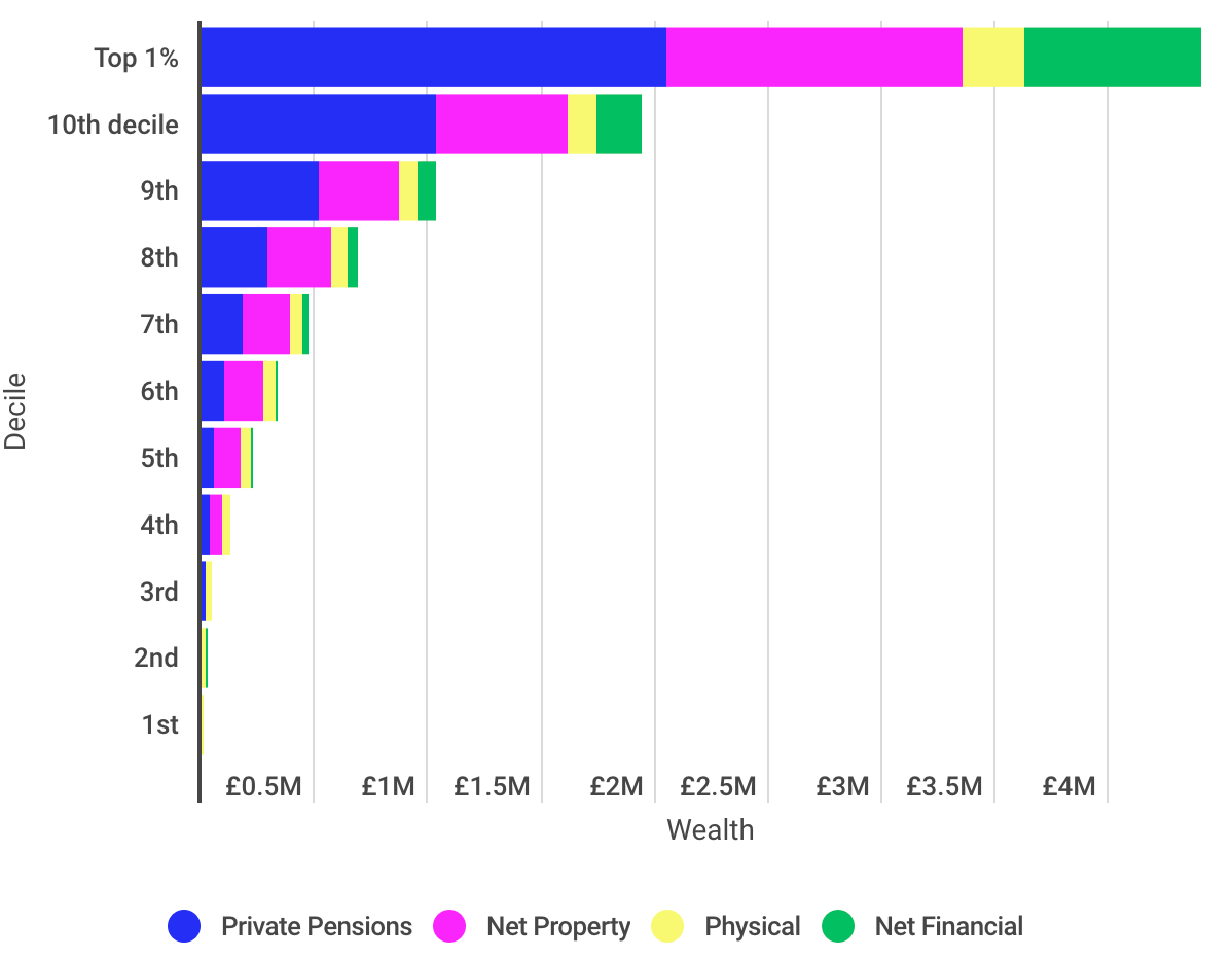 | Decile | Private pensions | Net Property | Physical | Net financial | Total |