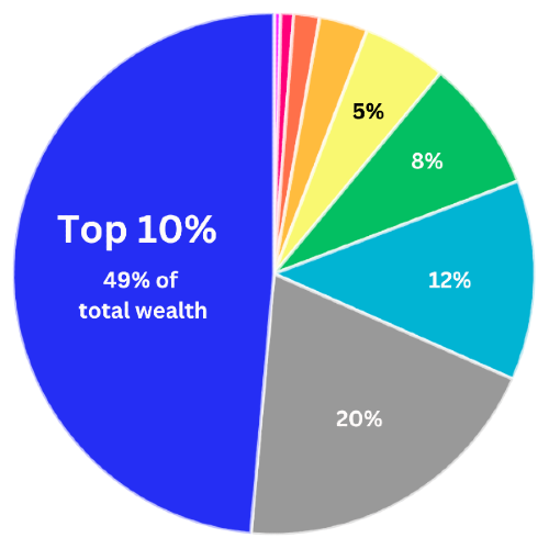 So, for example, in blue you can see that the top 10% of the UK population in terms of wealth controls nearly 50% of the country's wealth as a whole. Similarly, the next 10% controls 20%, then 12% and so on.